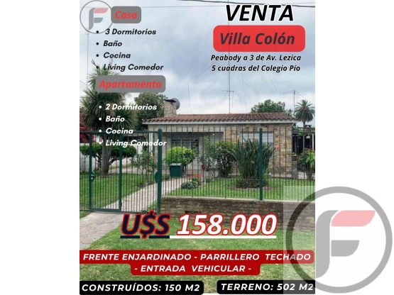 Casa en Villa Colón a 1 cuadra de Av. Lezica, 2 de Colegio Pío. Transporte público, servicios y entros educativos muy cerca. Amplia casa de construcción tradicional en muy buen estado. Sólida, muy luminosa estilo chalet. A la cual se le suma un apartamento construido con posterioridad. Construcción también tradicional y con techo liviano.